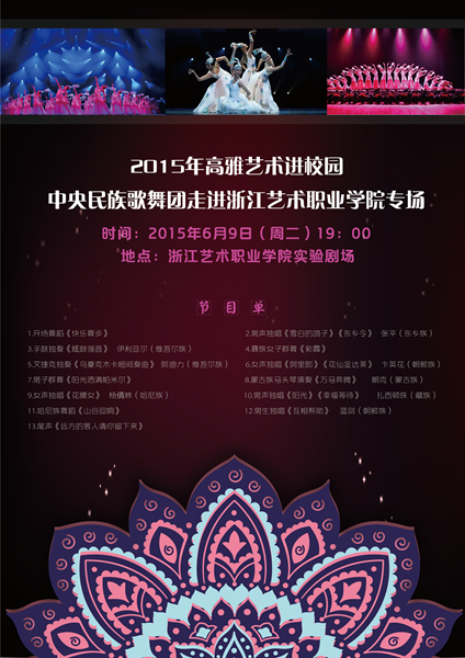 中央民族歌舞团成立于1952年9月,是中国唯一的国家级少数民族艺术表演团体。以继承、繁荣、发展少数民族文化艺术为宗旨,受到各族人民喜爱。中央民族歌舞团汇集诸多少数民族艺术资源,在国家重大活动上、民族地区庆典上、精品艺术舞台上,中央民族歌舞团中国少数民族歌舞艺术的普及、发扬和光大做出过重大贡献。该团荟萃来自蒙、回、壮、藏、维吾尔等37个民族众多优秀少数民族艺术家,他们中有蒋大为、德德玛、杨丽萍、腾格尔、曲比阿乌等艺坛常青树,有刘媛媛、吴彤、彝人制造等后起之秀,以及一大批全国知名编导、词、曲作家及少数民族器乐演奏家。作为友谊和文化交流的使者,中央民族歌舞团出访过一百多个国家以及台湾、香港、澳门地区进行演出交流,把中国少数民族淳朴善良的情怀传递给世界五大洲,在国际上享有很高的声誉。