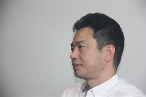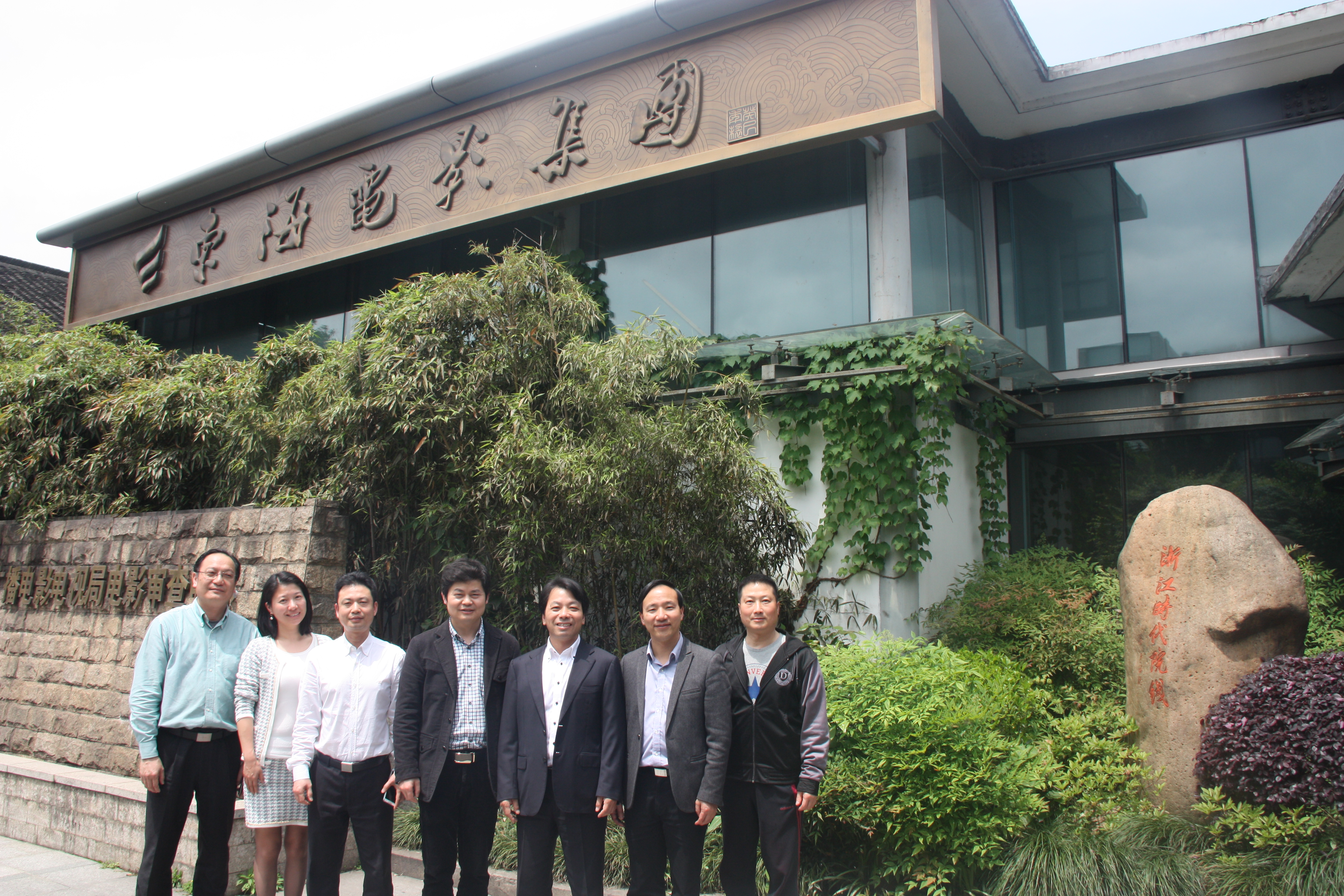 走访校友第二站在西溪创意产业园,东海电影集团就在这里办公。几座小楼绿水环绕,掩映在树林中,别有诗意。