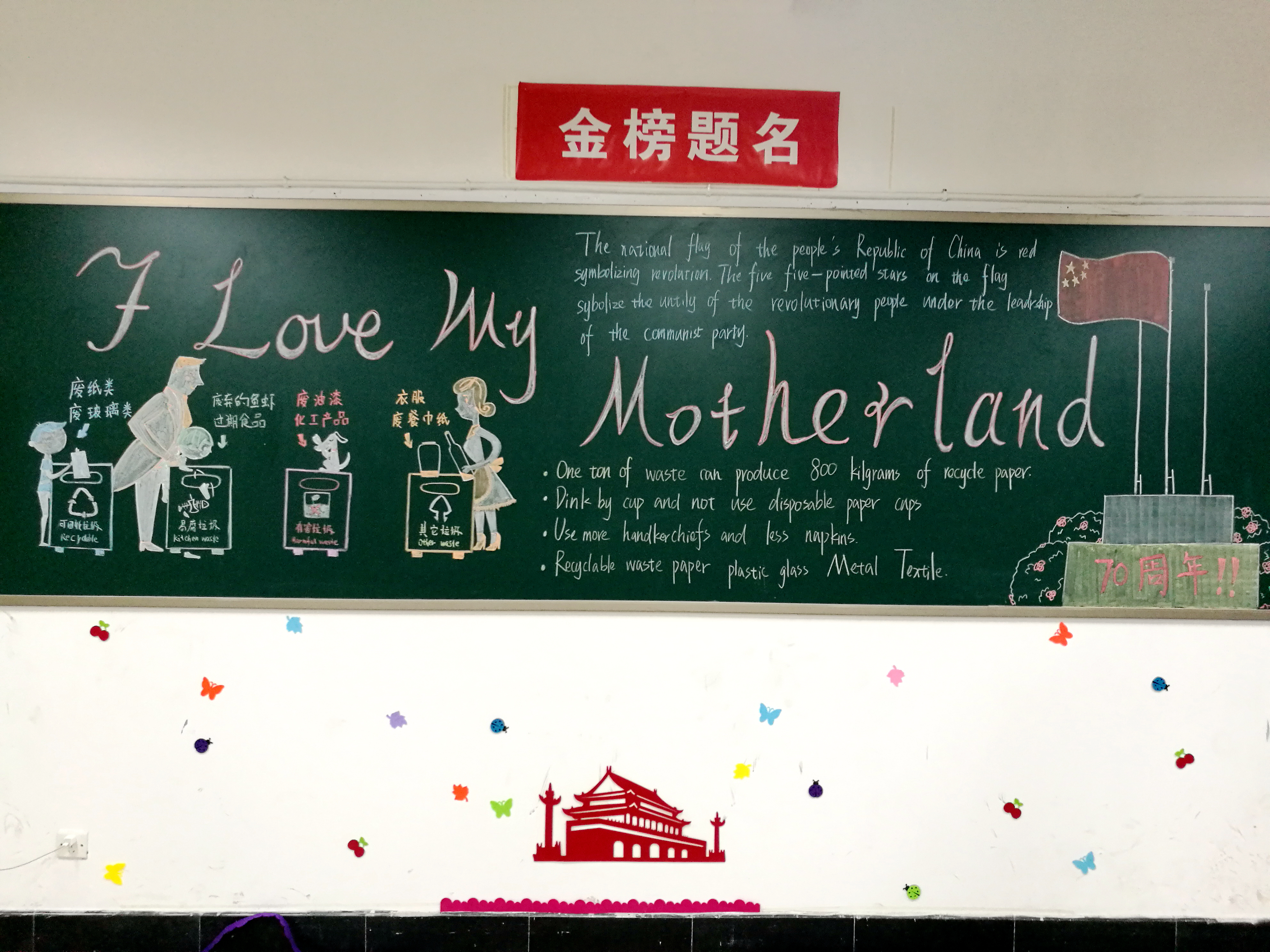 本次教室美化大赛从9月初启动,18个班级的学生们在班主任的细心指导下,查阅资料,精心设计,通过诗歌、图片、文章、音乐等各种形式,表达了对祖国母亲的美好祝愿。