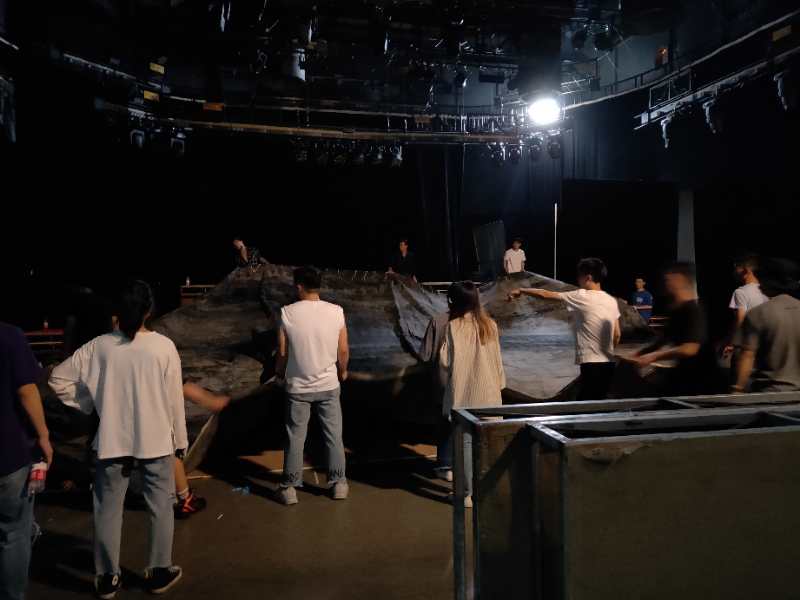 装台阶段,同学和舞美师傅们一同在剧场,由于4场大戏轮流演出,一台结束后常常要连夜翻台,十分辛苦。