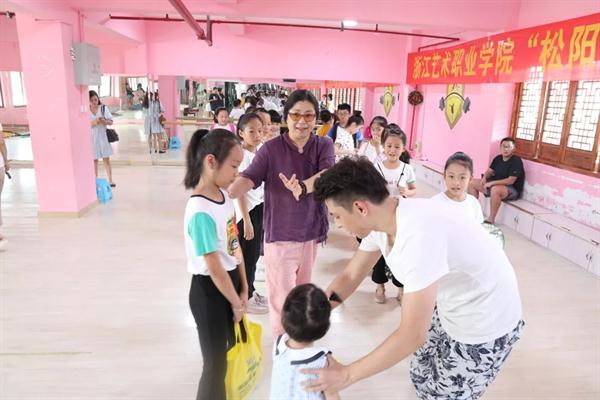 在松阳县玉岩实验教育集团,戏剧系教授孙丽萍带领支教小分队师生与该校“松阳高腔”社团的17名同学结成对子,进行为期5天的集中辅导。在下午的课程中,17名同学被分成花旦、小生两个小组,老师们耐心讲解每一个动作细节,同学们认真领悟每一个动作要领,反复练习,让在场的每一位都感受到了中华传统文化的魅力。