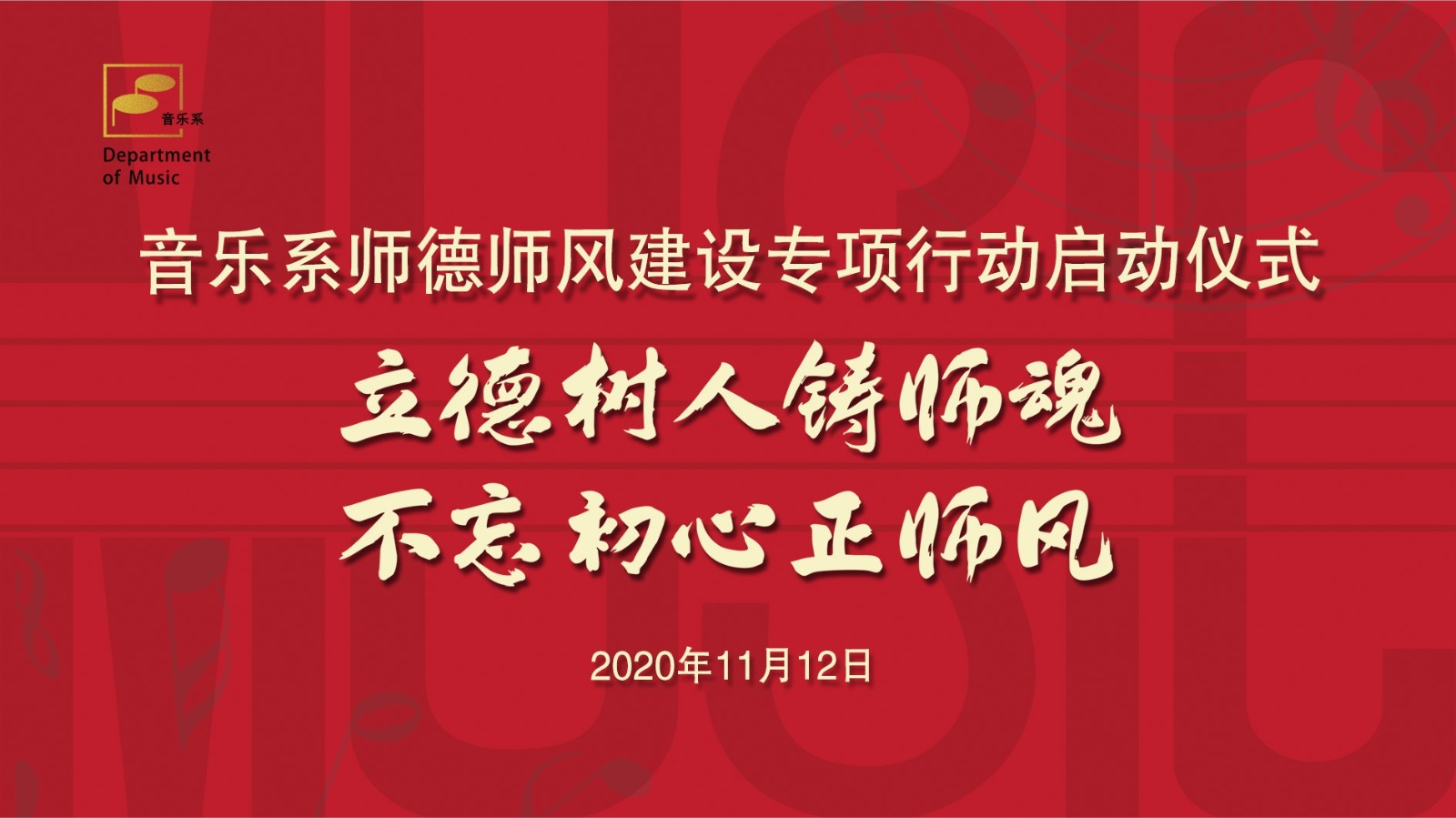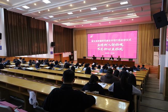 为全面贯彻落实习近平总书记关于加强教师队伍建设的新思想新理念新要求,音乐系决定在2020年以及未来更长的一段时间内,开展“立德树人铸师魂 不忘初心正师风”师德师风建设专项行动。11月12日,音乐系在图信中心报告厅举行师德师风建设专项行动启动仪式。校党委书记薛亮出席会议并讲话,音乐系全体教职工参加。