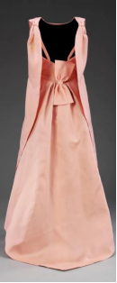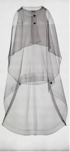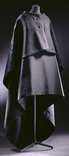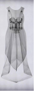 在材质运用上,选择硬挺的真丝加萨尔面料能让裙子实现如雕塑般塑形。裙子主体是由背面拼接的单块布料制成。内部的紧身胸衣(在X光片中可见)确保了裙装的与身体的安全贴合。或是在后背中线处拼接,同学们在X光片中,可以看到前片下摆处有的两个重锤,以增加垂坠感。斗篷的颈部经过精心拼合,以确保线条柔和,又具塑型形。
