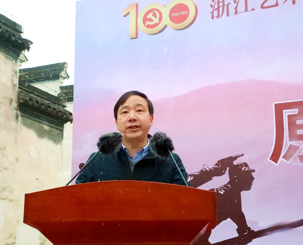 夏开堂作讲话,他代表学校,向参与话剧创作和演出的老师们、同学们致以问候,向中共长兴县委宣传部、长兴县文旅体局、长兴县文旅集团、长兴县煤山镇人民政府表示感谢。浙艺作为全国唯一一所入选“双高计划”的综合性高职艺术院校,话剧《清溪谣》的创作是戏曲表演专业建设群的一项成果。在全党上下正在开展党史学习教育之际,话剧《清溪谣》开排适逢其会,他要求浙艺师生们讲好中国共产党故事,创作和演绎展示党的伟大历程、伟大成就的优秀作品,为“文化浙江”“诗画浙江”建设提供有力人才支撑,在浙江“重要窗口”建设中发出浙艺声音、贡献浙艺智慧。
