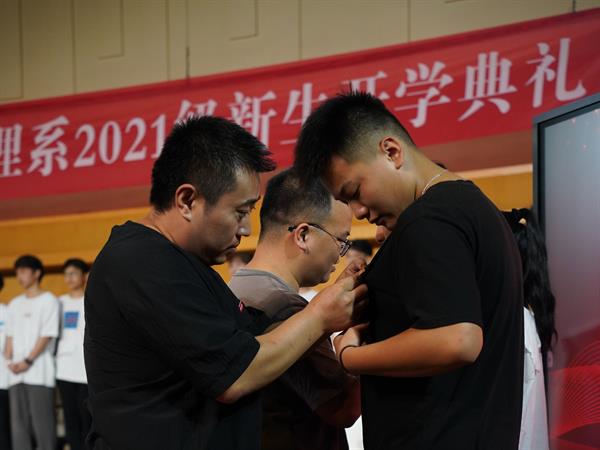文化管理系全体教师为新生代表佩戴校徽。老师们真挚的言语和温暖的怀抱让每位同学心里都流淌着阵阵暖意。