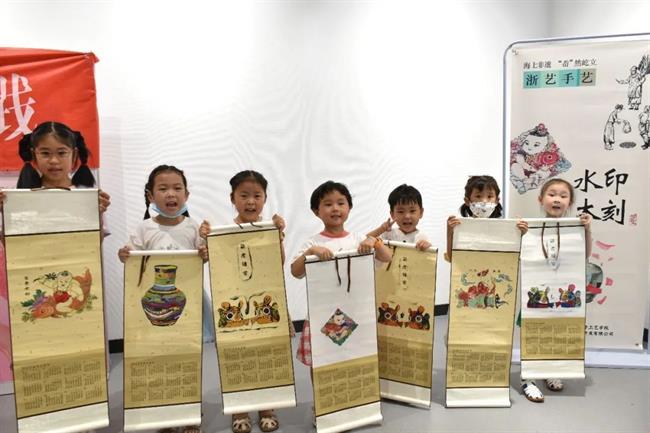 木刻韶年,水印芳华。手工艺学子现场示范绘、刻、印等一系列制作流程,将宣纸、木板和颜料巧妙融合,一幅幅精美的水印木刻版画跃然纸上,让孩子们连连感叹水印木刻的神奇。