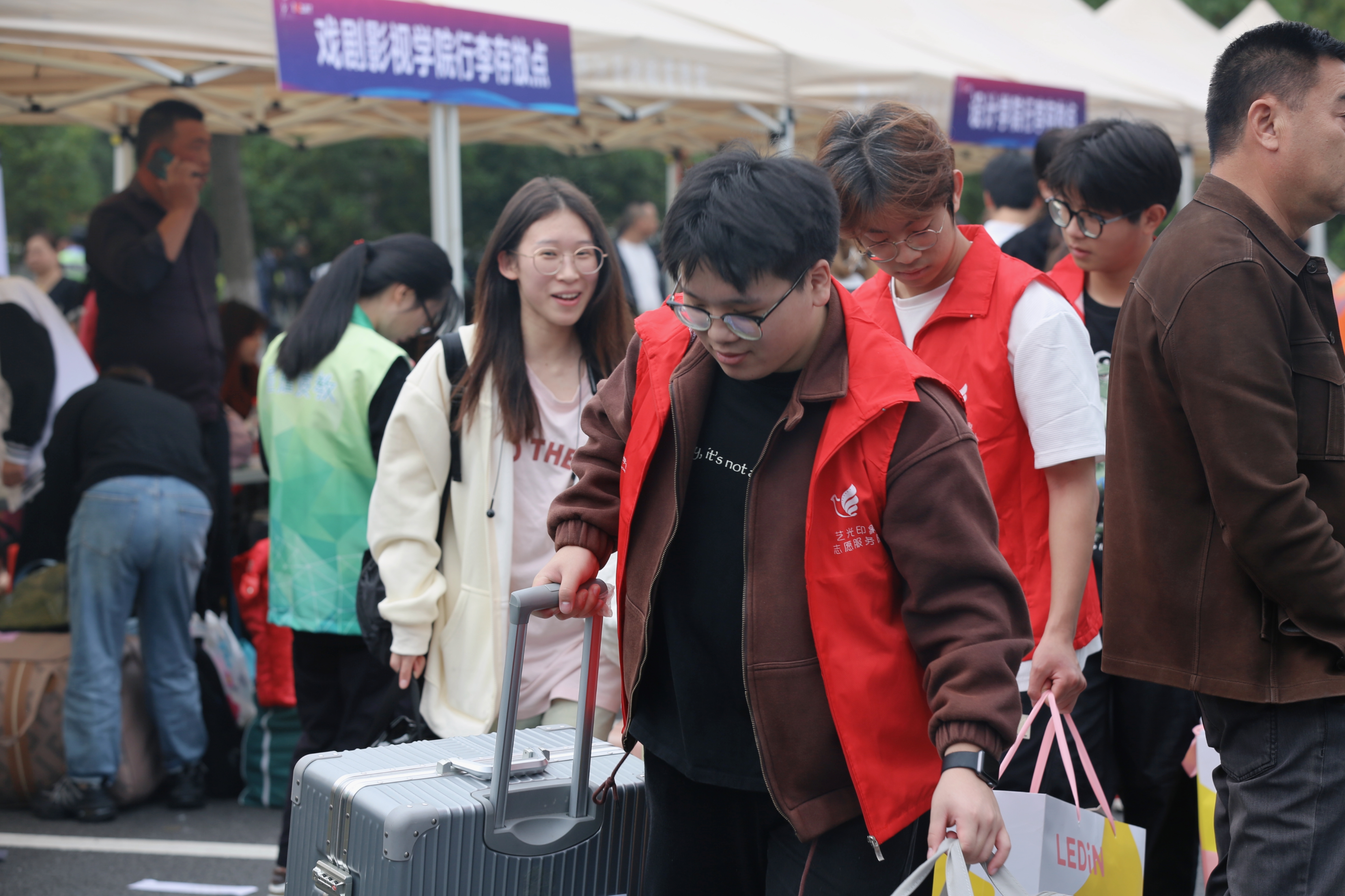 志愿者热情似火,成了现场靓丽的一道风景线。他们搬运行李、指引道路,无论大小事,每名志愿者都尽心尽力,帮助新浙艺人开启新梦想。行李存放处、摆渡车旁随处可见志愿者的身影,认真负责,有条不紊。优美的校园环境、周全的迎新设备、暖心的志愿服务,助力新生们快速融入校园生活。