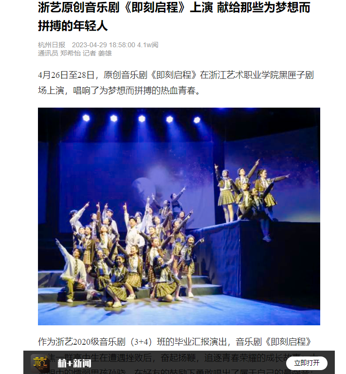杭州日报:浙艺原创音乐剧《即刻启程》上演 献给那些为梦想而拼搏的年轻人