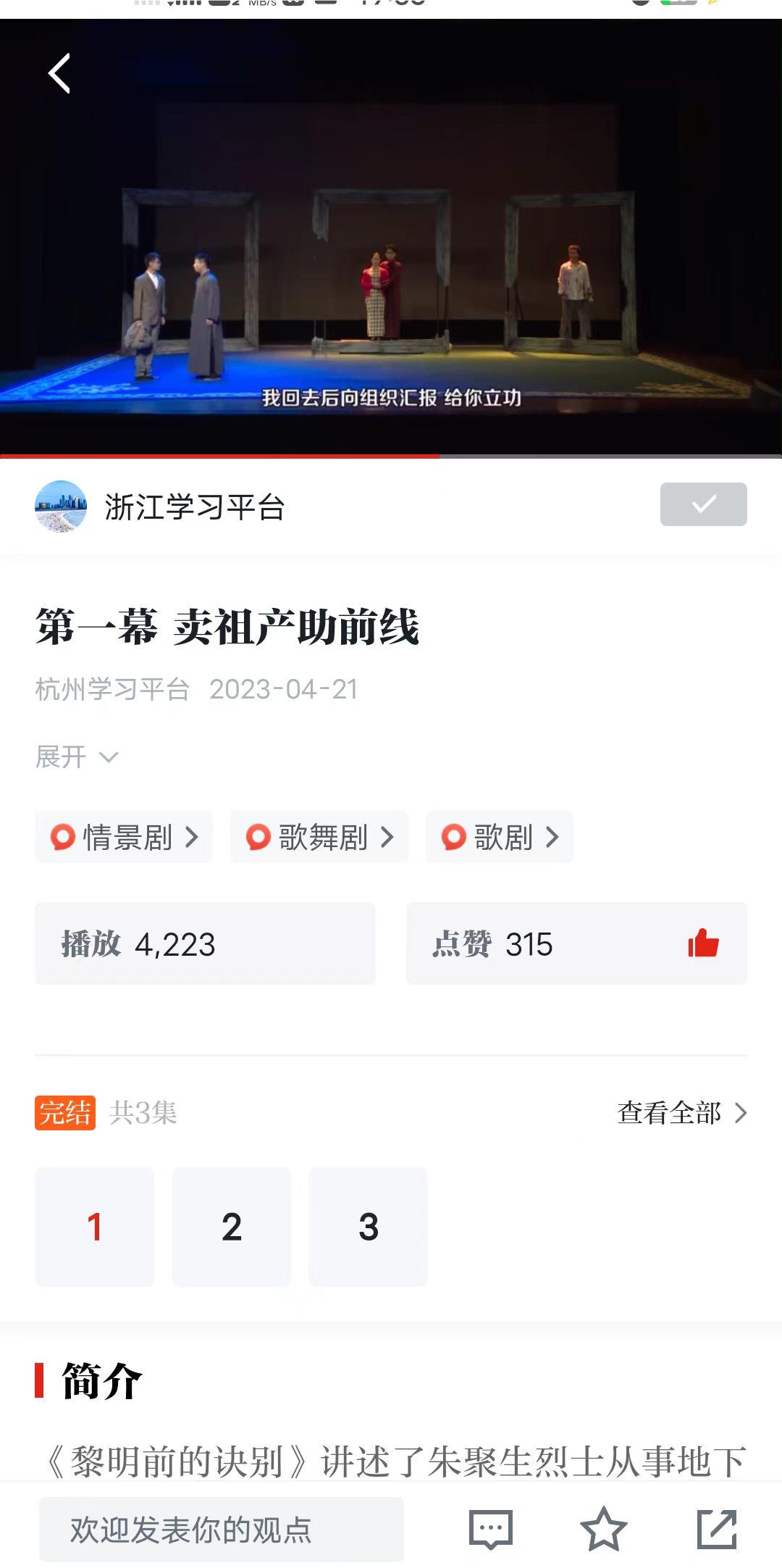 学习强国全国平台:原创情景剧《黎明前的诀别》第一幕 卖祖产助前线
