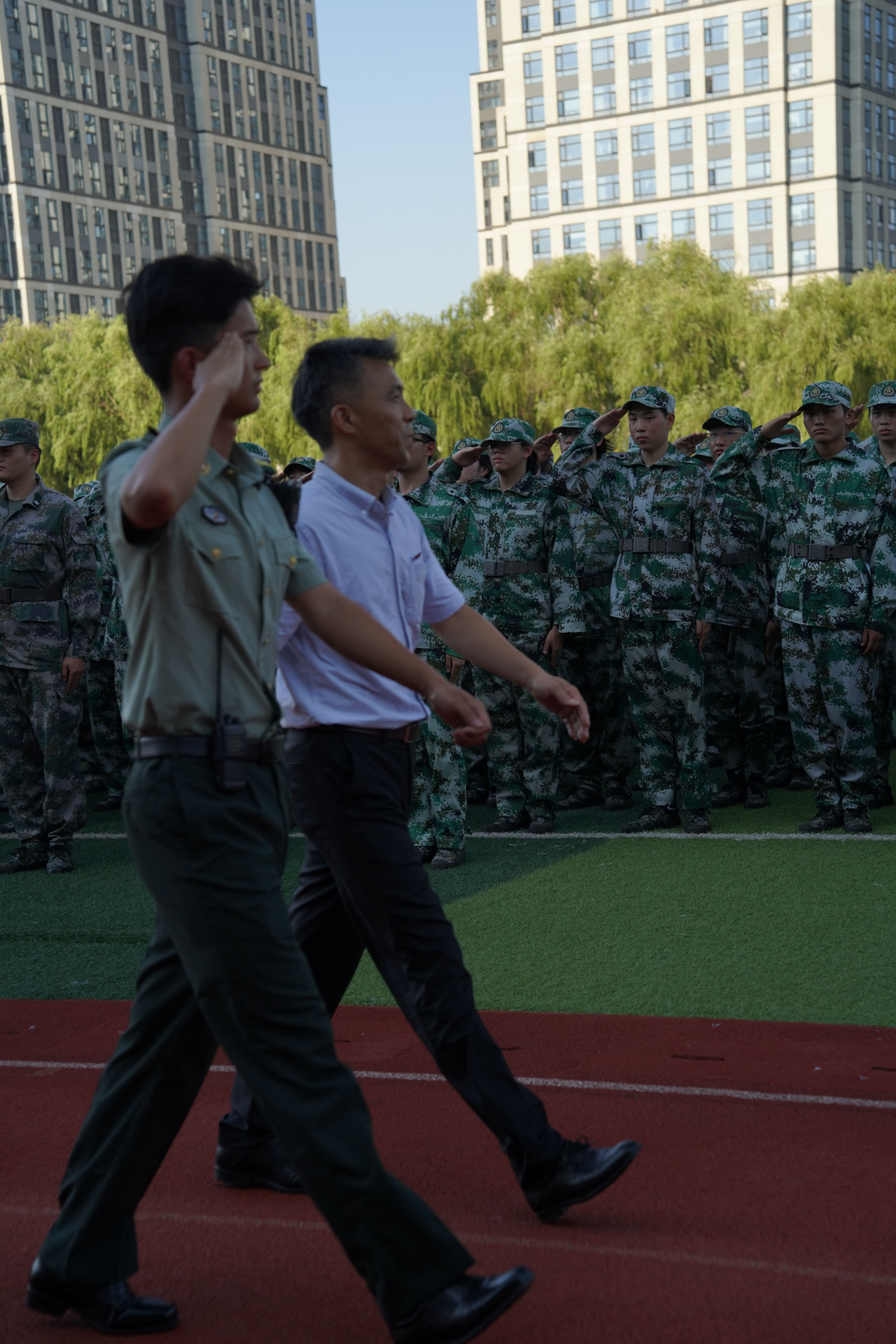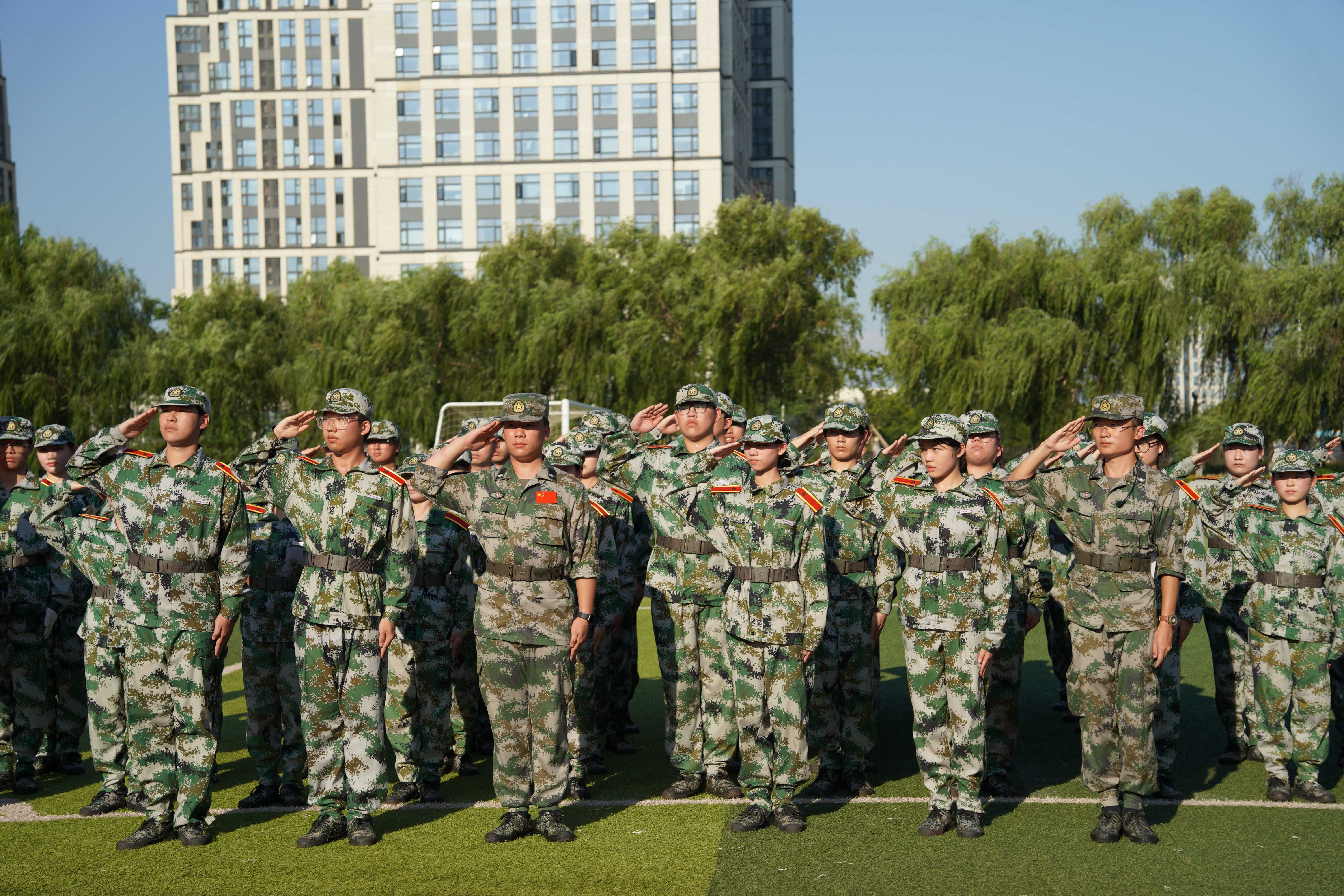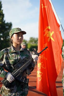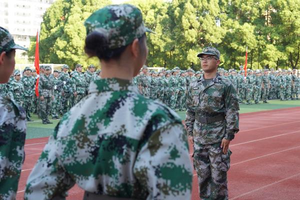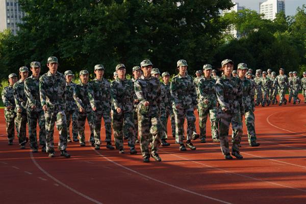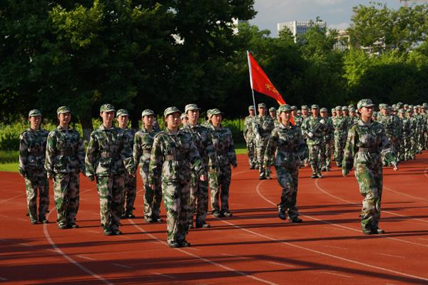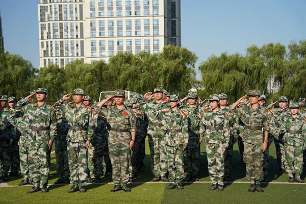红旗飘扬,军歌嘹亮。运动场上,同学们身着迷彩,排列整齐,以饱满的精神和昂扬的气势接受领导检阅。