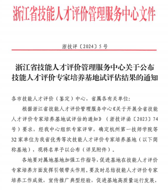 评选根据浙江省技能人才评价管理服务中心《关于开展全省技能人才评价专家培养基地试评估的通知》(浙技评函【2023】74号)要求,经省中心组织专家评审,最终评选出32家单位为浙江省优秀等次技能人才评价专家培养基地。